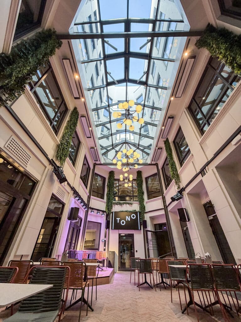 Alle som bruker TONO Studio har også tilgang på 1. etasje i TONO-huset, og er hjertelig velkommen til å kjøpe lunsj i personalrestauranten og spise under åpen himmel i atriet.